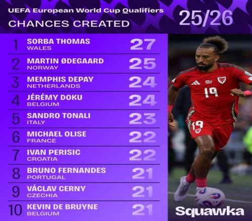 本届世欧预小组赛已经打好,squakwa也统计了本届赛事创造机会情况,多位名将在列。