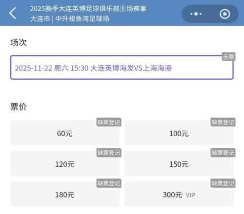 11月18日下午,2025中超收官轮大连英博与上海海港一役的球票,正式开票。结果,此役延续了大连梭鱼湾足球场的火爆态势,各档次的球票早早售罄。